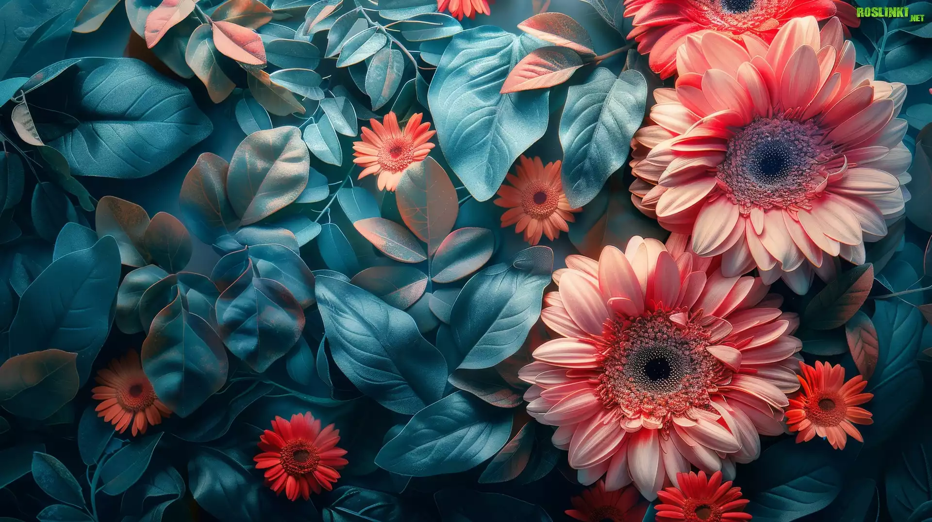 Rośliny: Kwiaty, Gerbery, Niebieskie, Liście