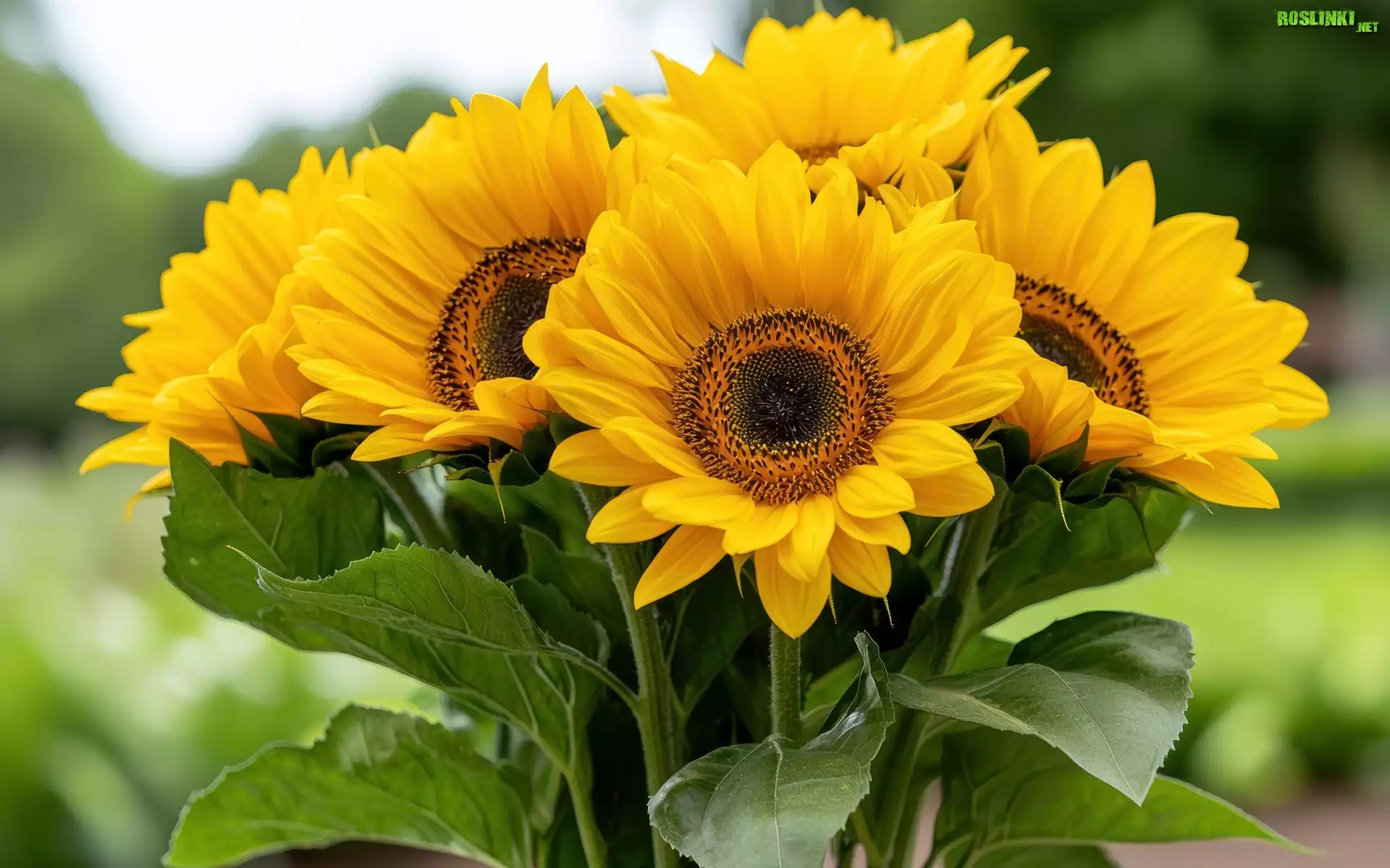 Rośliny: Kwiaty, Słoneczniki, Wiązanka, Liście
