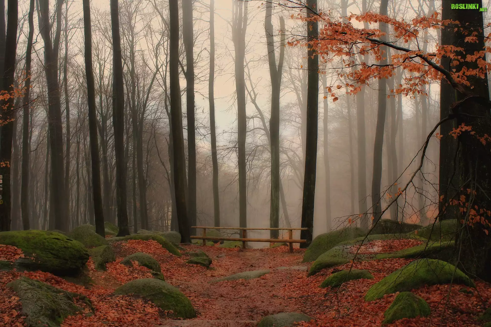 Rośliny: Jesień, Drzewa, Las, Mgła, Ogrodzenie, Omszałe, Kamienie, Opadłe, Liście