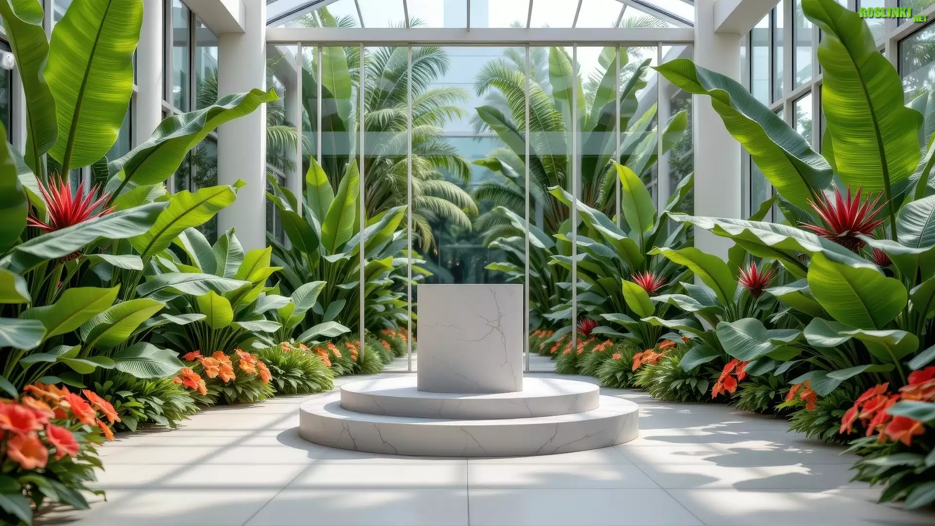 Rośliny: Podium, Kwiaty, Palmy, Liście