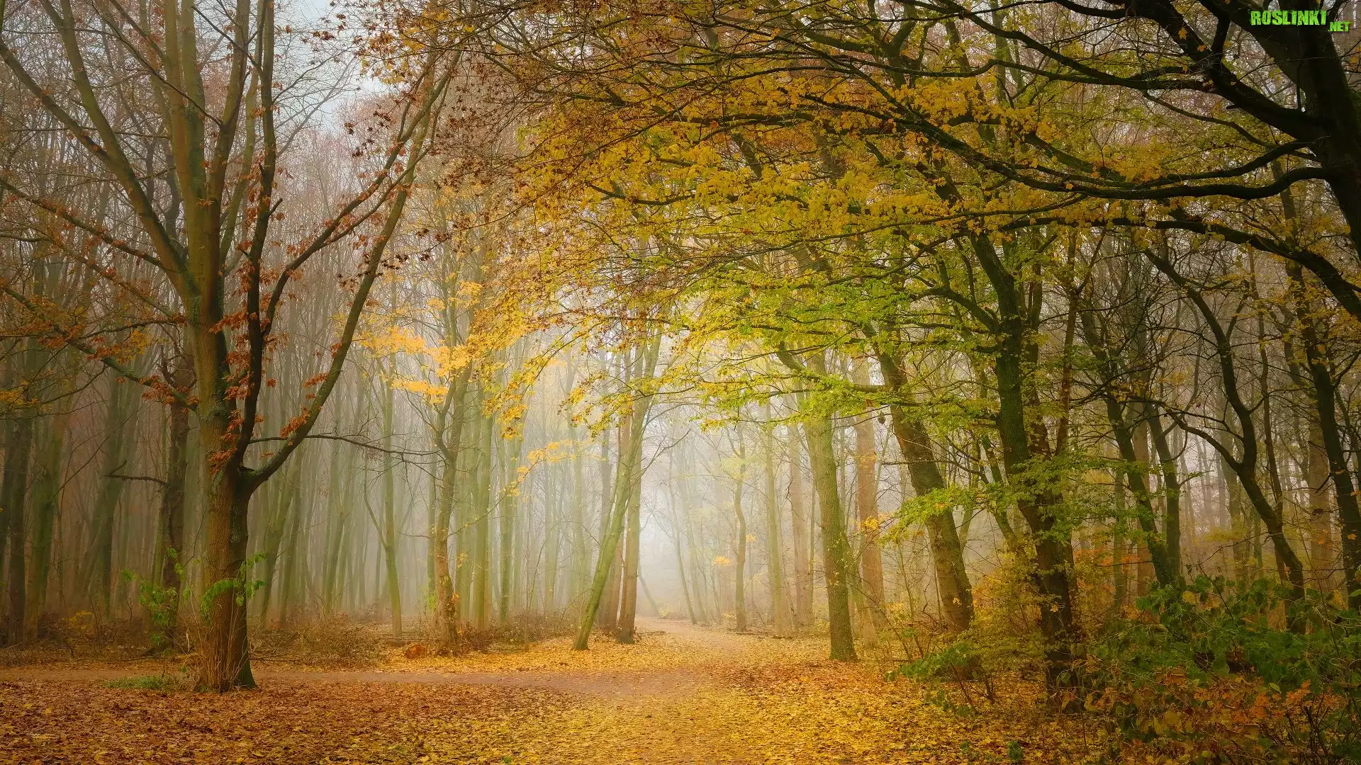 Rośliny: Jesień, Las, Drzewa, Liście, Mgła, Poranek