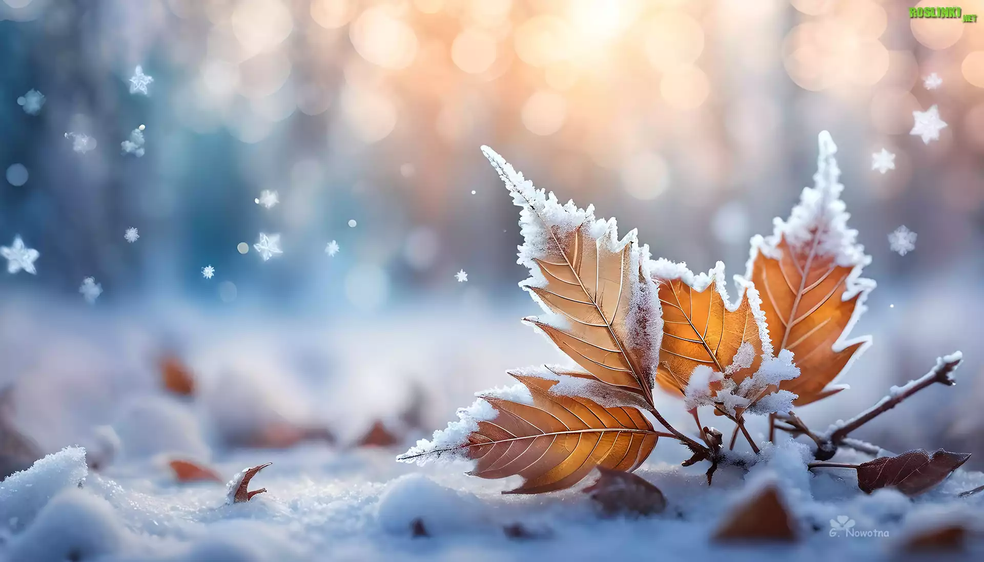 Oszronione, Liście, Śnieg, Zima, Grafika