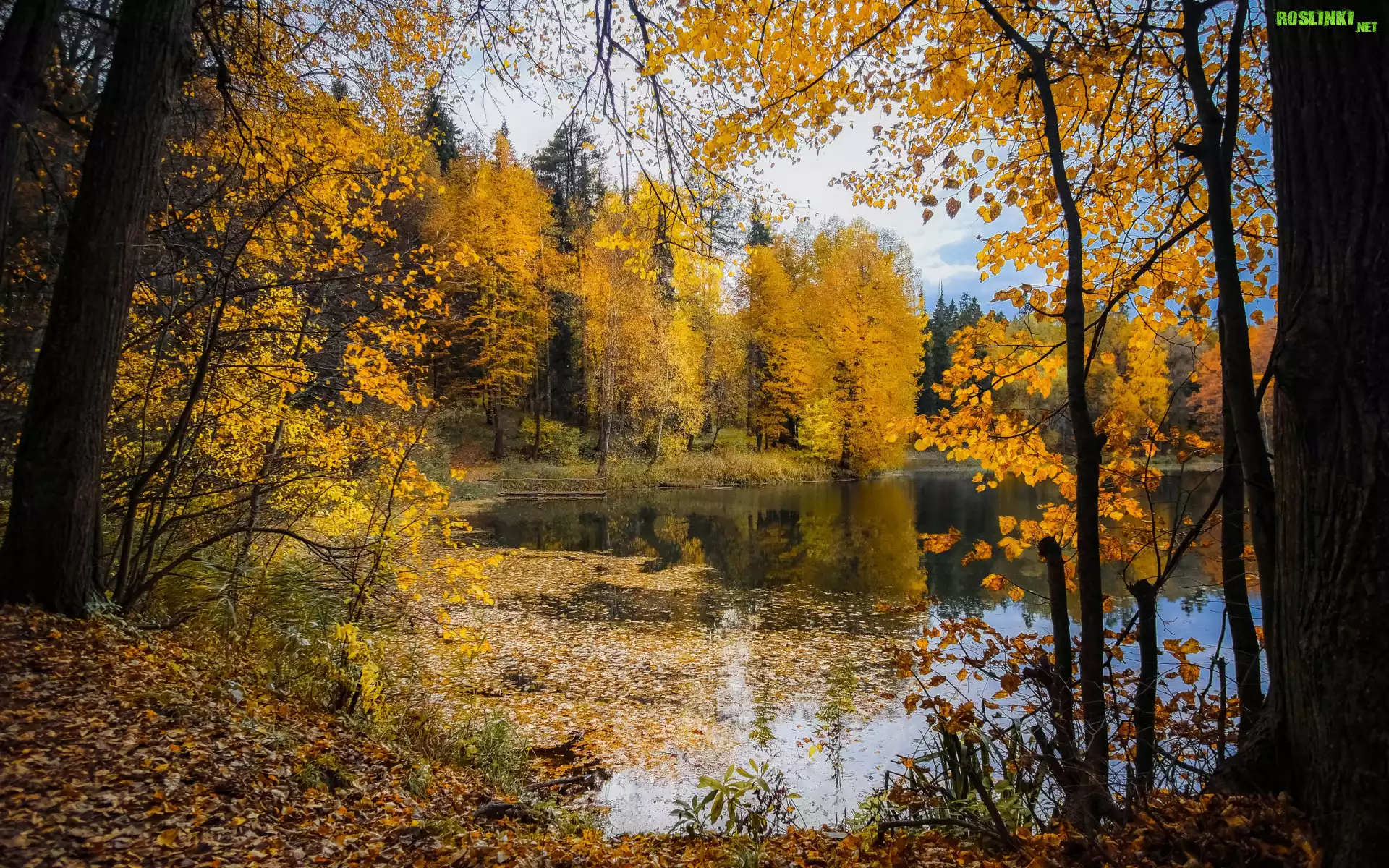 Rośliny: Las, Drzewa, Staw, Liście, Gałęzie, Niebo, Jesień
