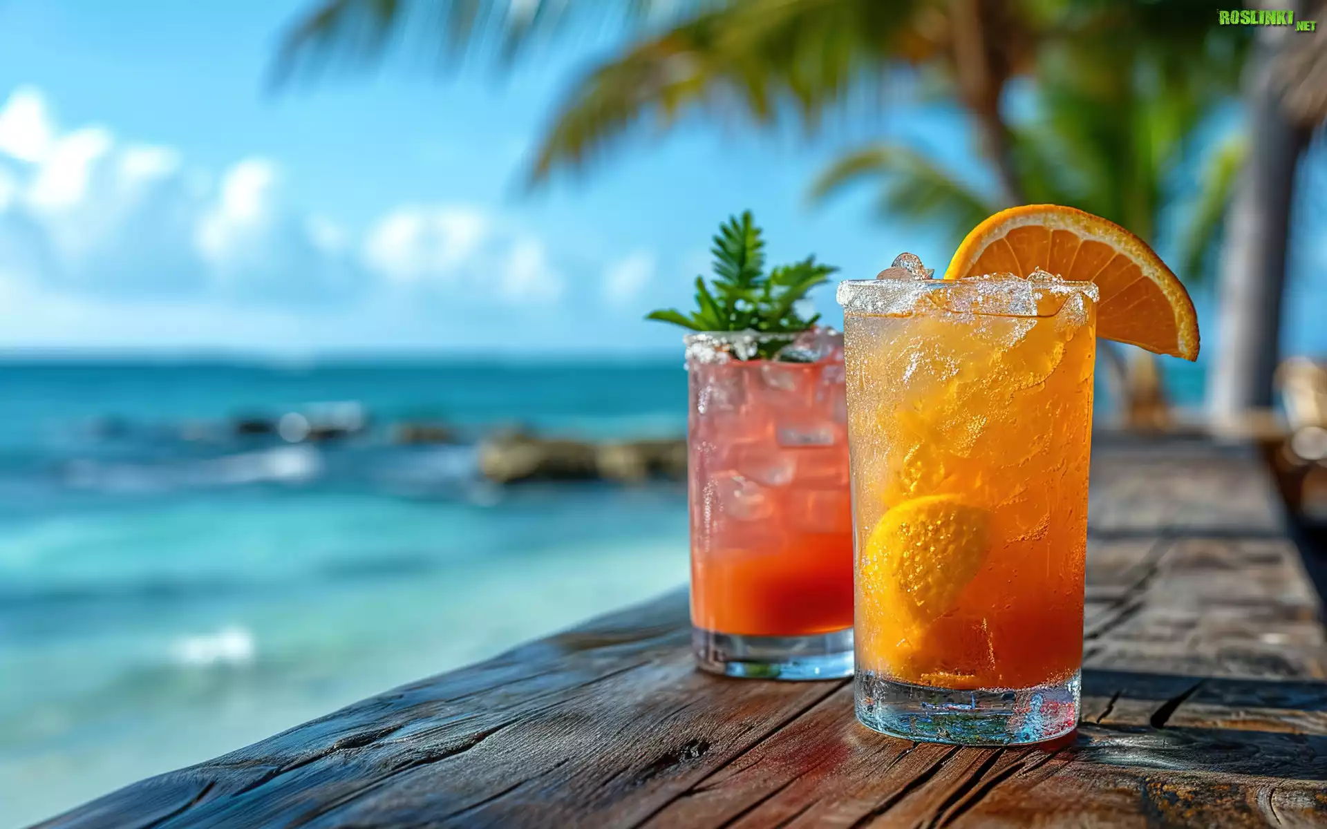 Rośliny: Morze, Palma, Stół, Szklanki, Napój, Koktajl, Lód, Plasterki, Pomarańczy, Lato, Tropiki