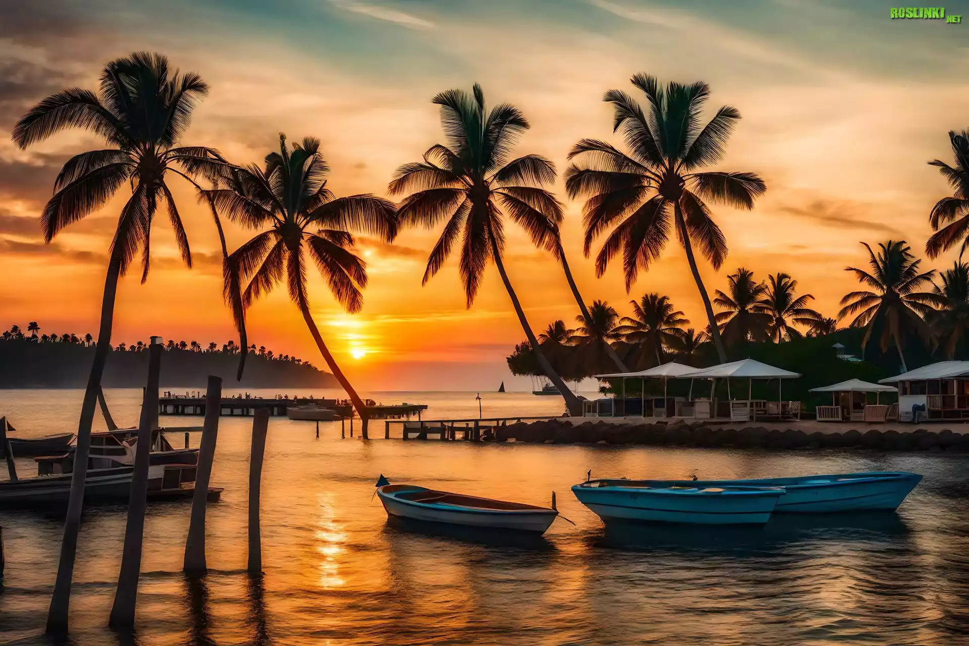 Rośliny: Zachód słońca, Morze, Łódki, Palmy, Domy