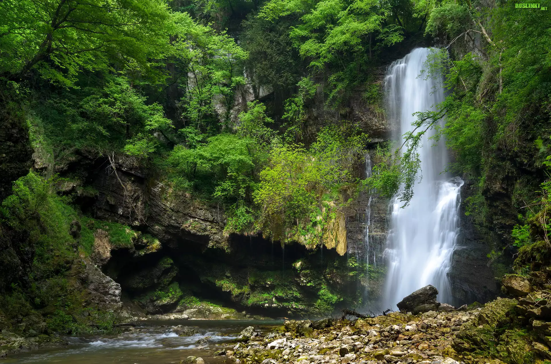 Rośliny: Włochy, Lombardia, Valganna, Wodospad Ferrera, Skały, Kamienie, Drzewa