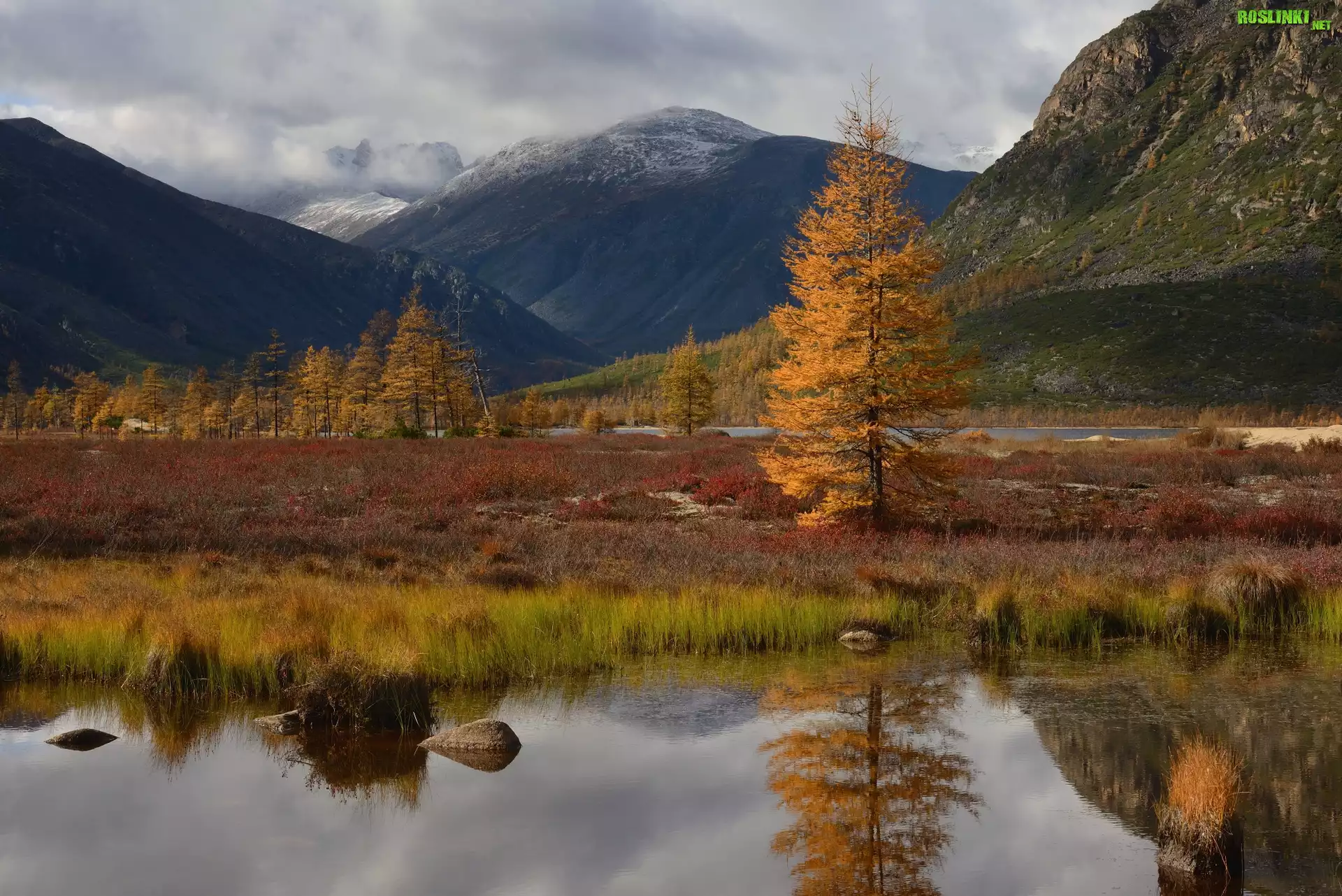 Góry Kołymskie, Jezioro Jack London, Drzewa, Trawa, Mgła, Odbicie, Jesień, Kołyma, Obwód magadański, Rosja |