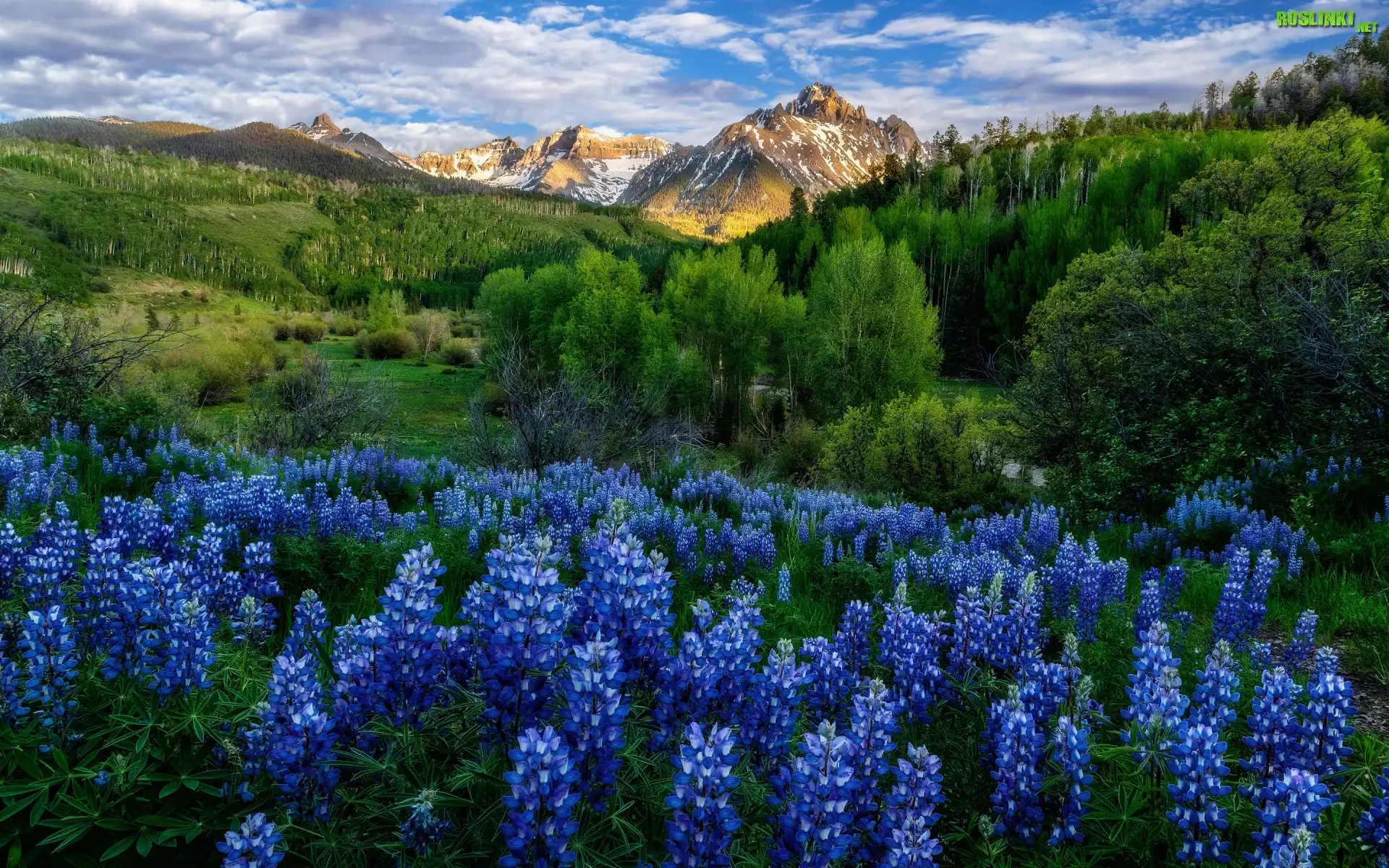 Rośliny: Góry, Polana, Kwiaty, Łubin, Drzewa, Zieleń, Chmury