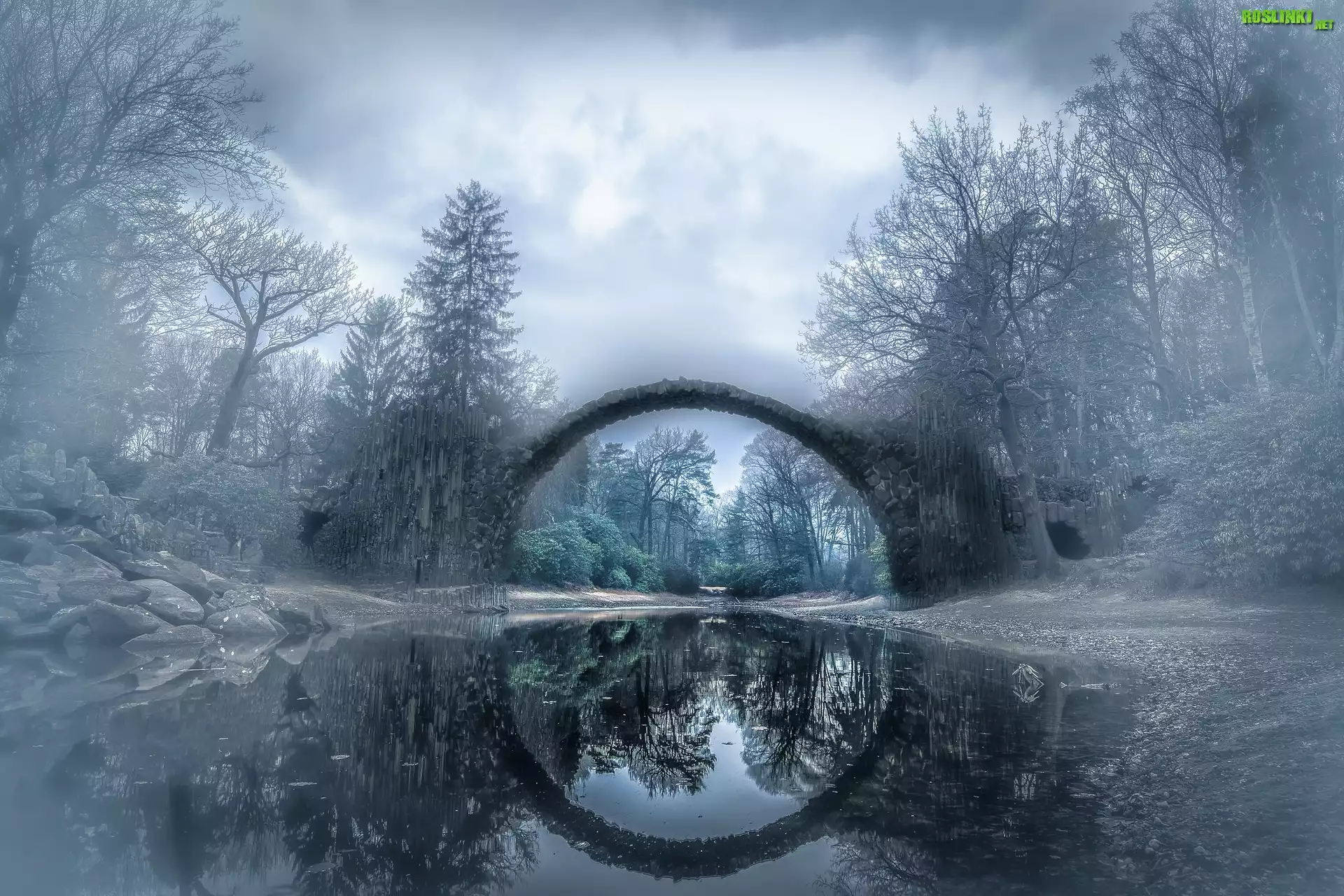 Rośliny: Kamienny, Most łukowy, Drzewa, Jezioro Rakotz, Mgła, Park Rododendronów Kromlau, Niemcy