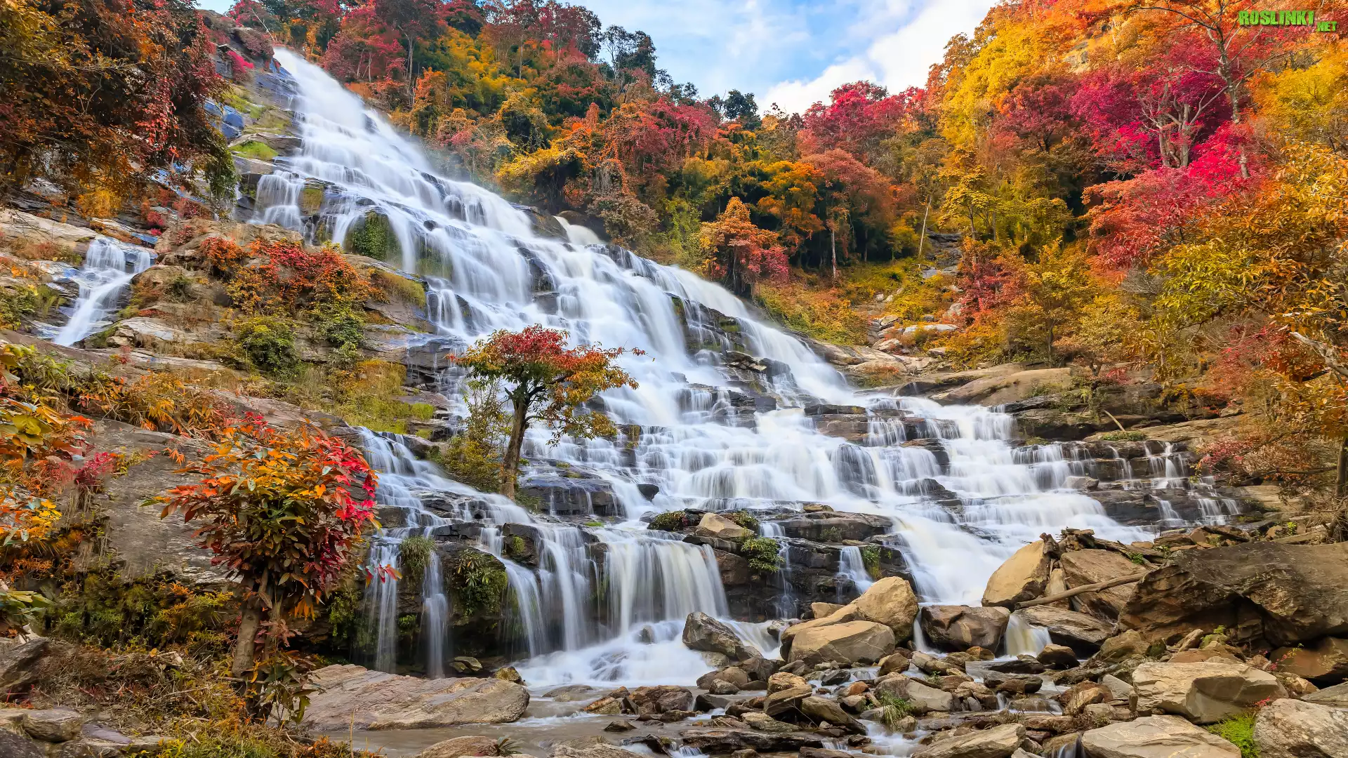 Jesień, Las, Drzewo, Skały, Kamienie, Wodospad, Mae Ya Waterfall, Park Narodowy Doi Inthanon, Chiang Mai, Tajlandia |