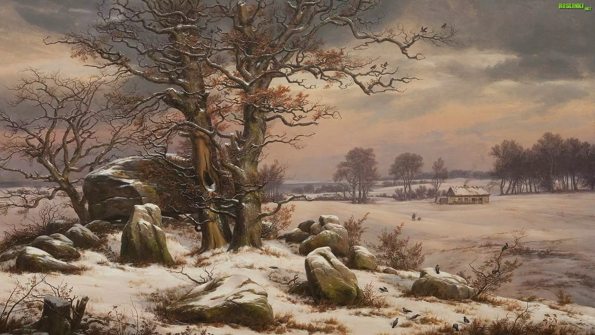 Malarstwo, Obraz, Johan Christian Clausen Dahl, Zima, Drzewa, Kamienie, Pole, Ptaki, Mężczyzna, Pies |