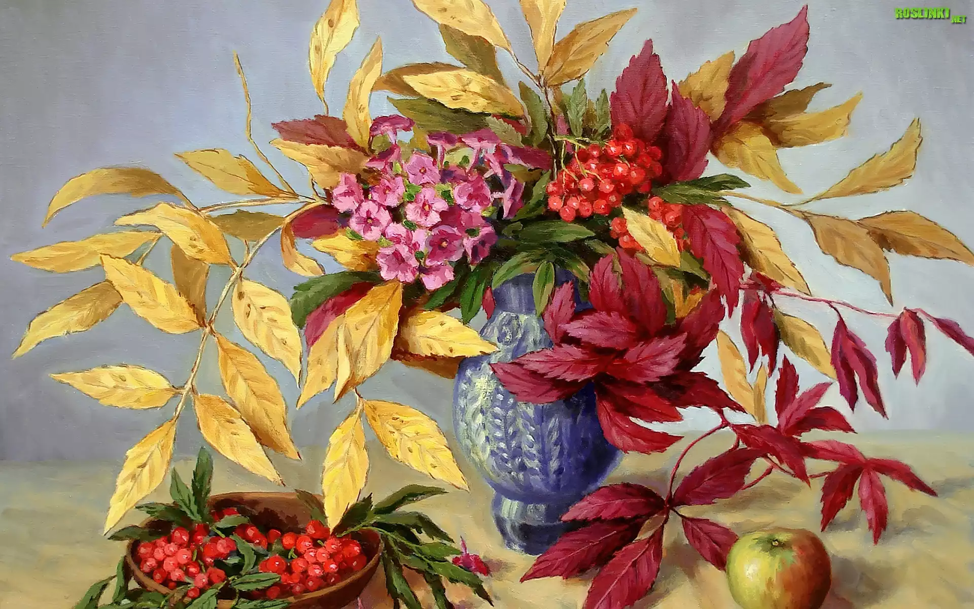 Rośliny: Malarstwo, Obraz, Kompozycja, Liście, Jarzębina, Kwiaty
