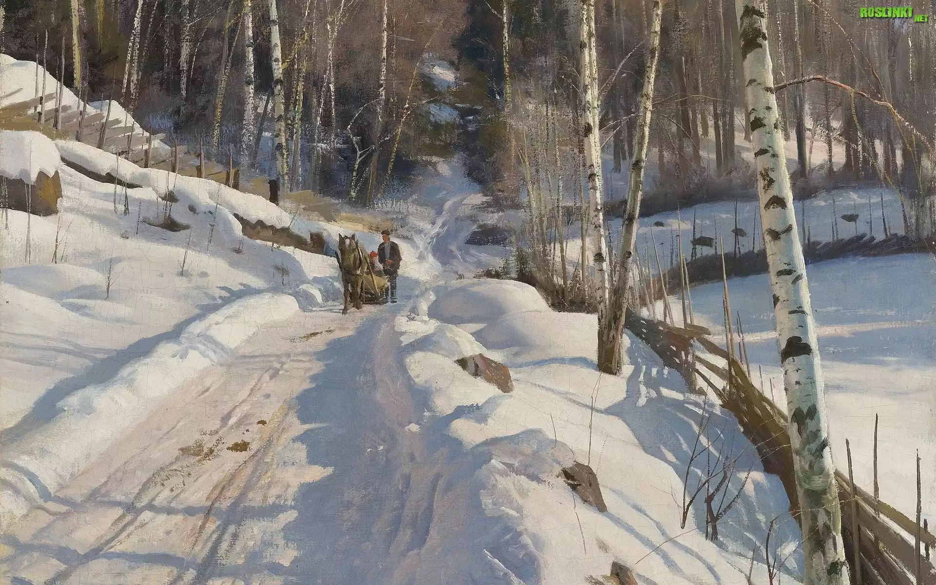 Malarstwo, Obraz, Zima, Koń, Sanie, Człowiek, Las, Drzewa, Brzozy, Droga, Ogrodzenie, Peder Monsted |