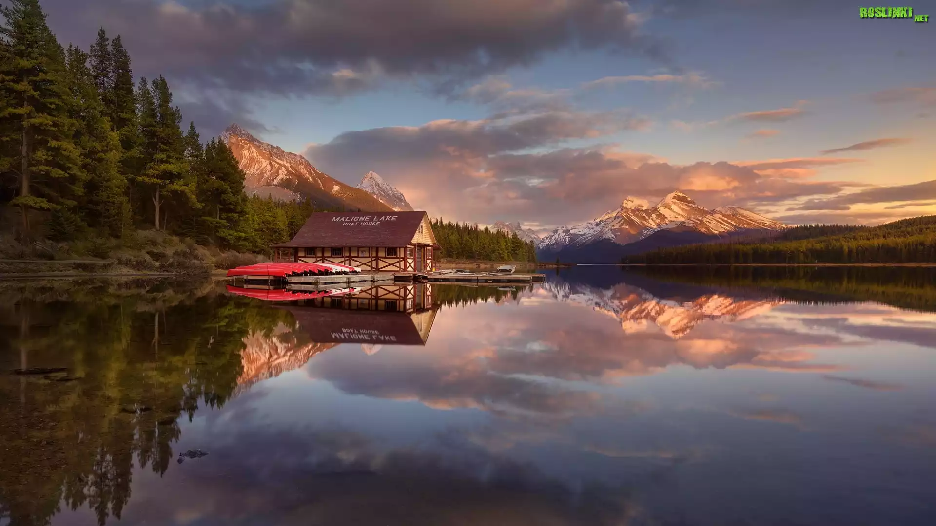 Rośliny: Kanada, Park Narodowy Jasper, Jezioro Maligne, Przystań, Góry, Las, Drzewa, Łódki, Odbicie