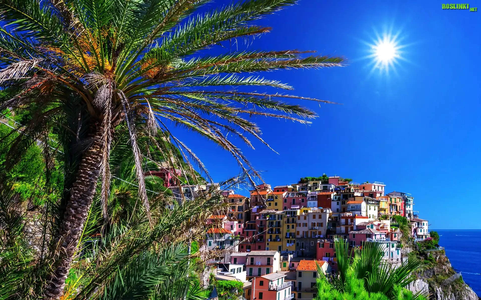 Rośliny: Manarola, Włochy, Miasto, Słońce, Palmy, Lato