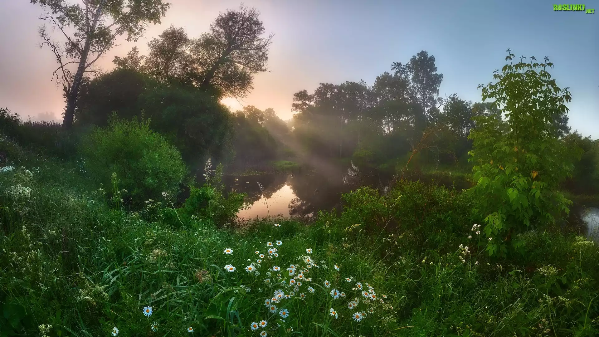 Rośliny: Promienie słońca, Lato, Łąka, Staw, Rośliny, Drzewa, Kwiaty, Margerytki