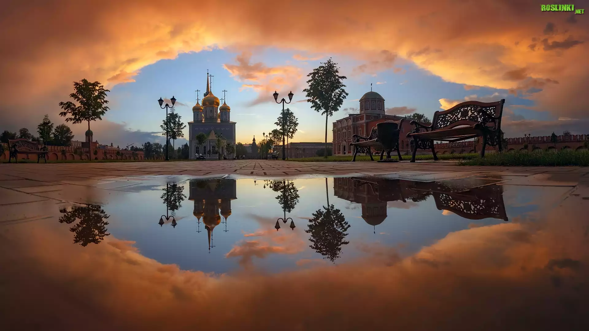 Cerkiew, Sobór Zaśnięcia Najświętszej Maryi Panny, Latarnie, Ławki, Drzewa, Chmury, Kałuża, Odbicie, Tuła, Rosja |