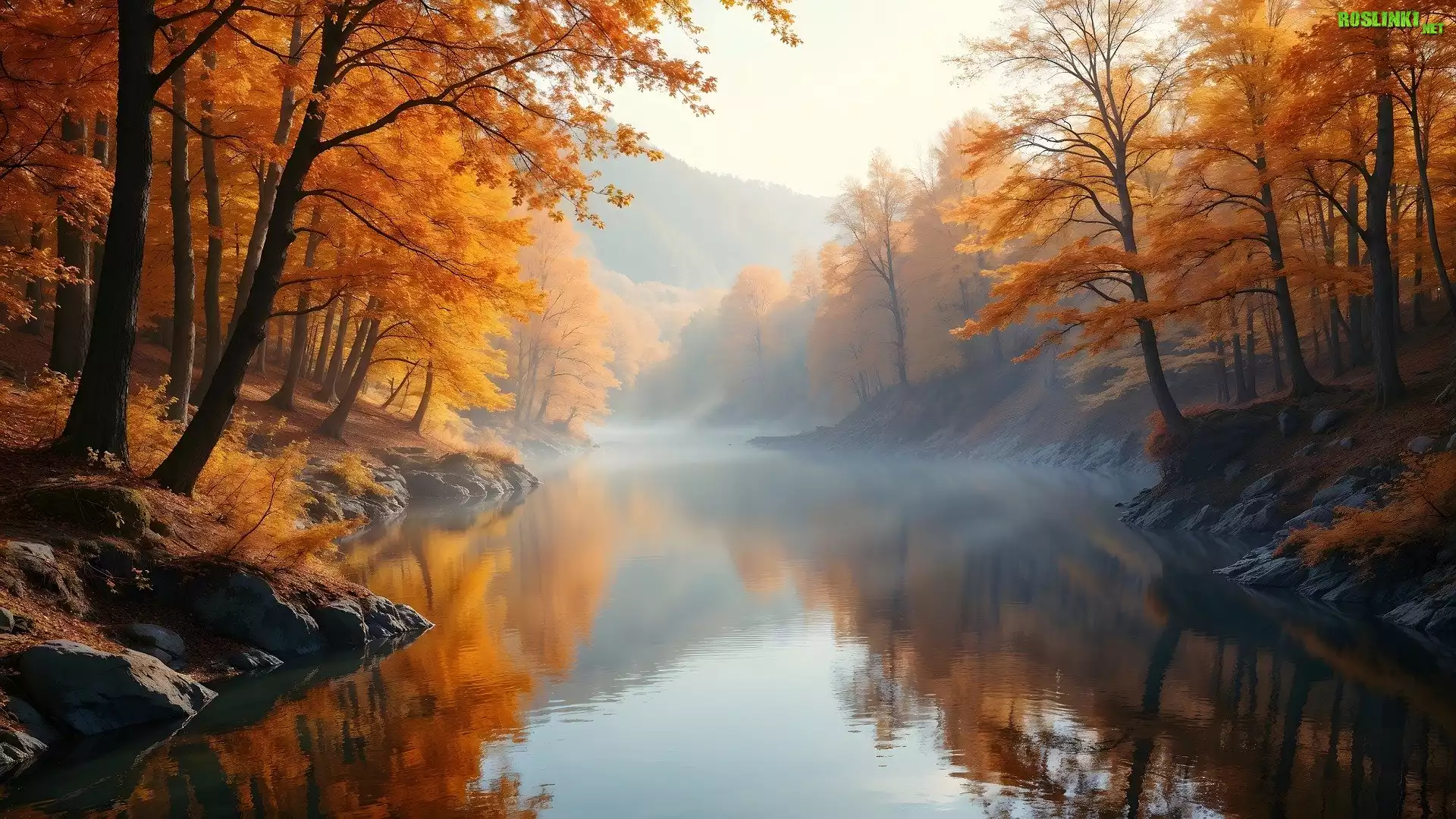 Rośliny: Jesień, Rzeka, Drzewa, Mgła, Grafika AI