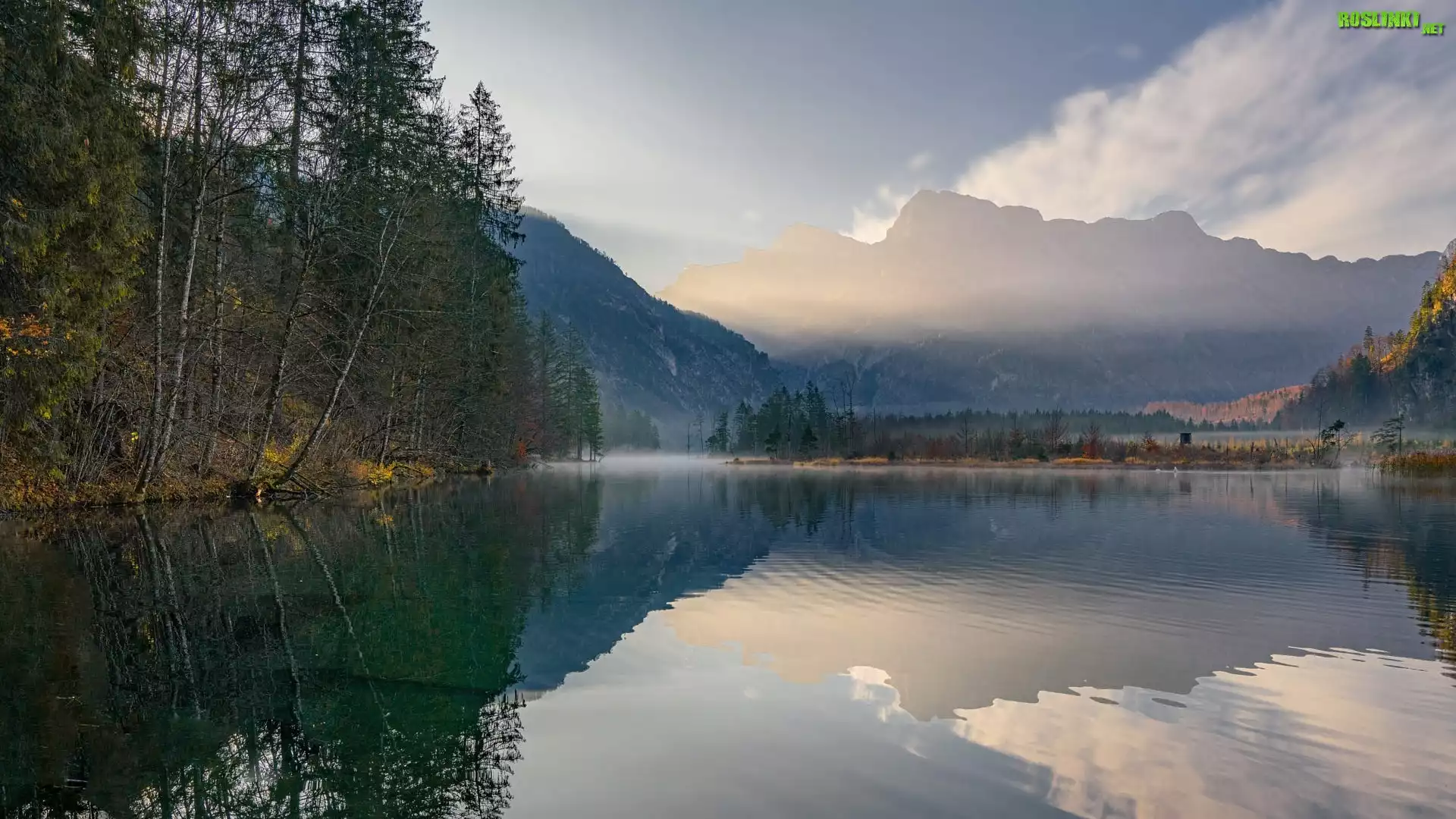 Rośliny: Góry, Jezioro Almsee, Mgła, Drzewa, Odbicie, Austria
