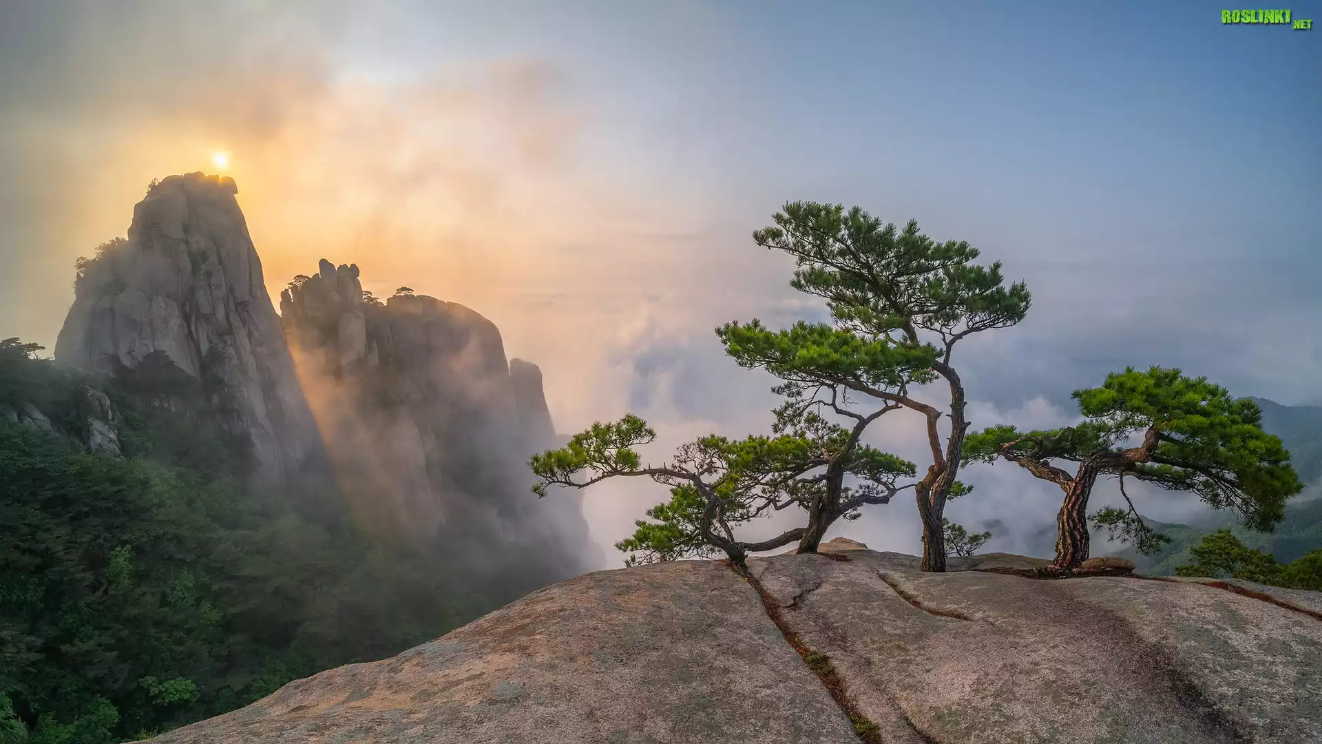 Rośliny: Korea Południowa, Dobongsan, Góry, Skały, Sosny, Słoneczne światło, Mgła