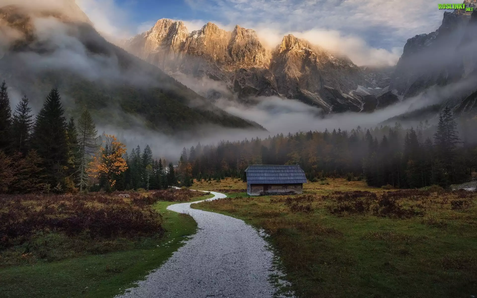 Rośliny: Góry, Las, Drzewa, Mgła, Dom, Droga