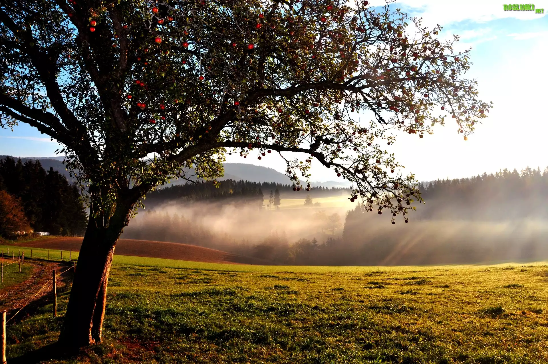 Rośliny: Łąka, Dróżka, Mgła, Drzewo