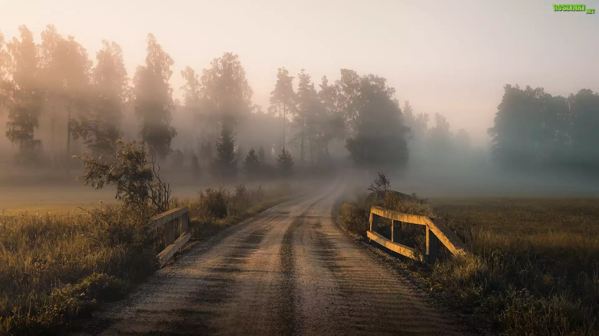 Rośliny: Mgła, Droga, Mostek, Drzewa, Trawa