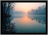 Jezioro, Mgła, Drzewa, Zachód słońca