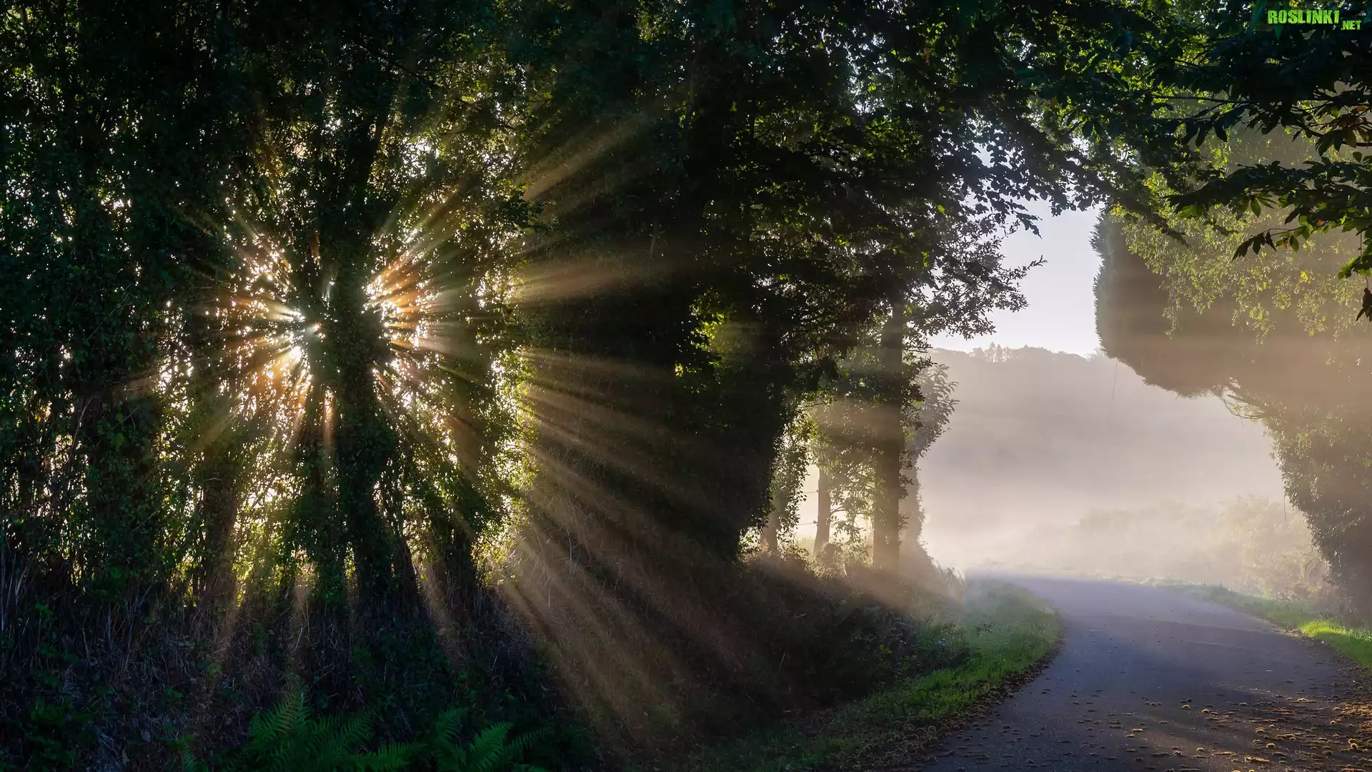 Rośliny: Droga, Mgła, Drzewa, Przebijające światło