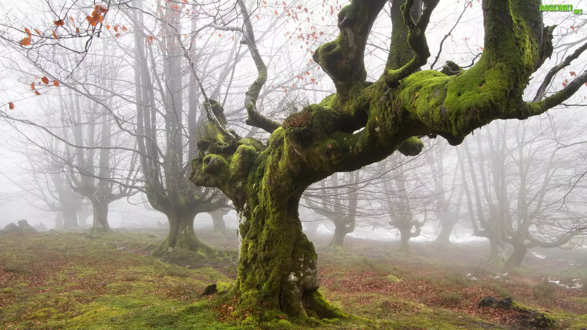 Rośliny: Jesień, Mgła, Stare, Krzywe, Drzewo, Liście, Mech