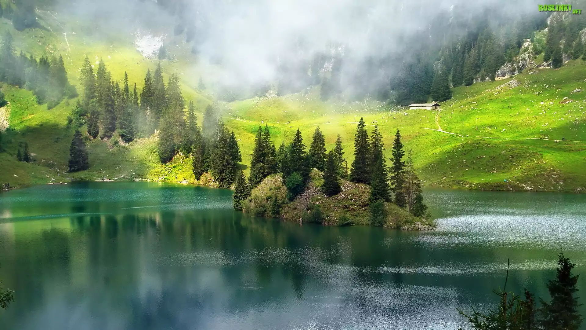 Rośliny: Góry, Mgła, Jezioro, Skała, Drzewa