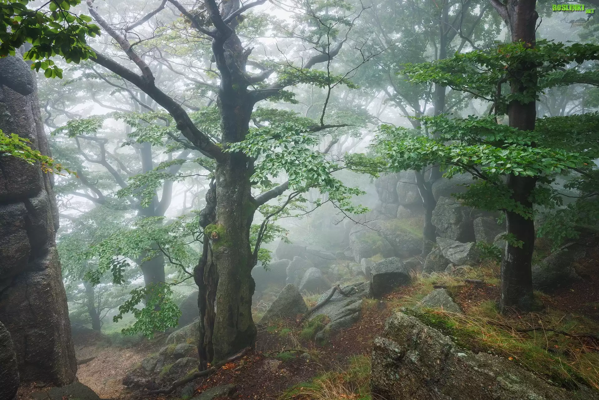 Rośliny: Las, Drzewa, Głazy, Mgła