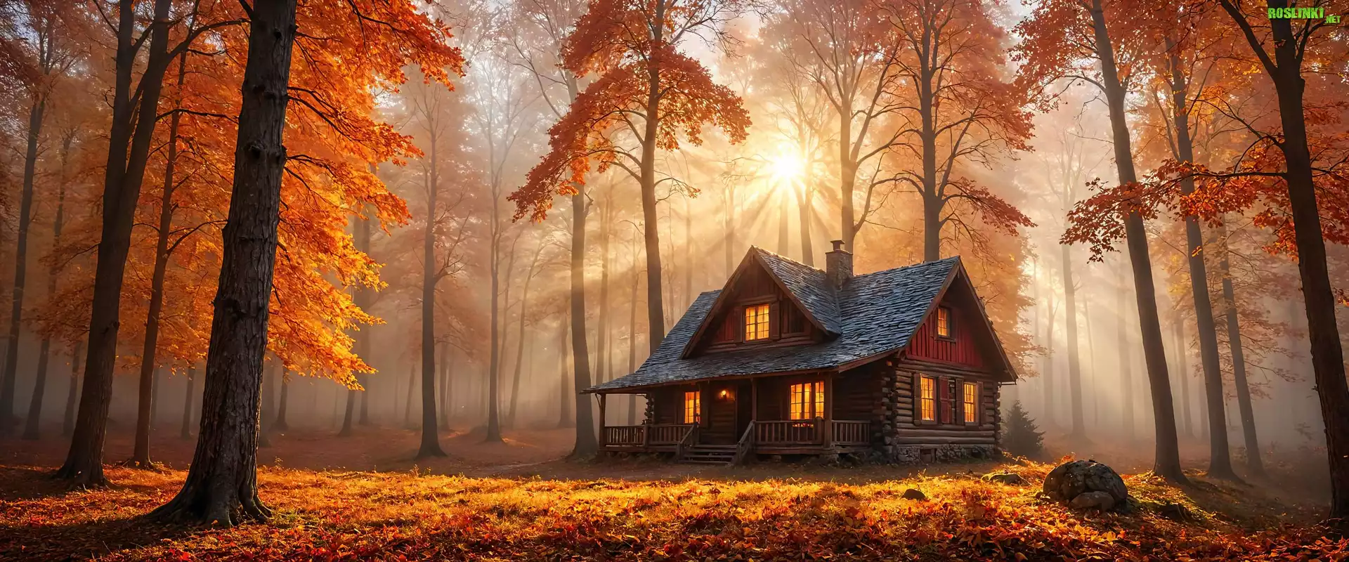 Rośliny: Jesień, Las, Dom, Światła, Wieczór, Drzewa, Mgła, Liście, Zachód słońca, Grafika