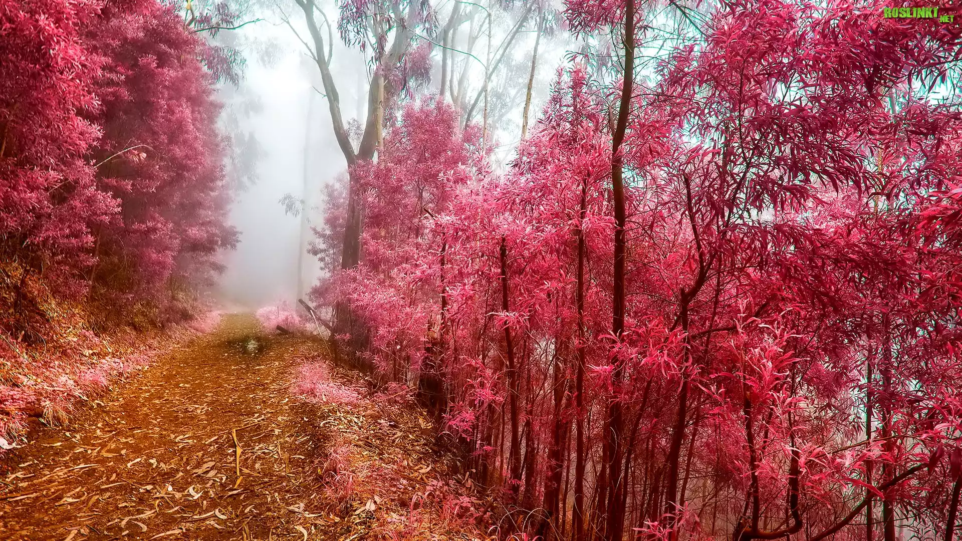 Rośliny: Mgła, Ścieżka, Drzewa, Czerwone, Liście, Jesień