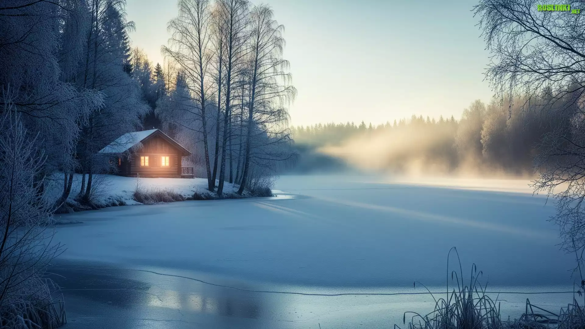 Rośliny: Zima, Jezioro, Lód, Mgła, Drzewa, Dom, Śnieg