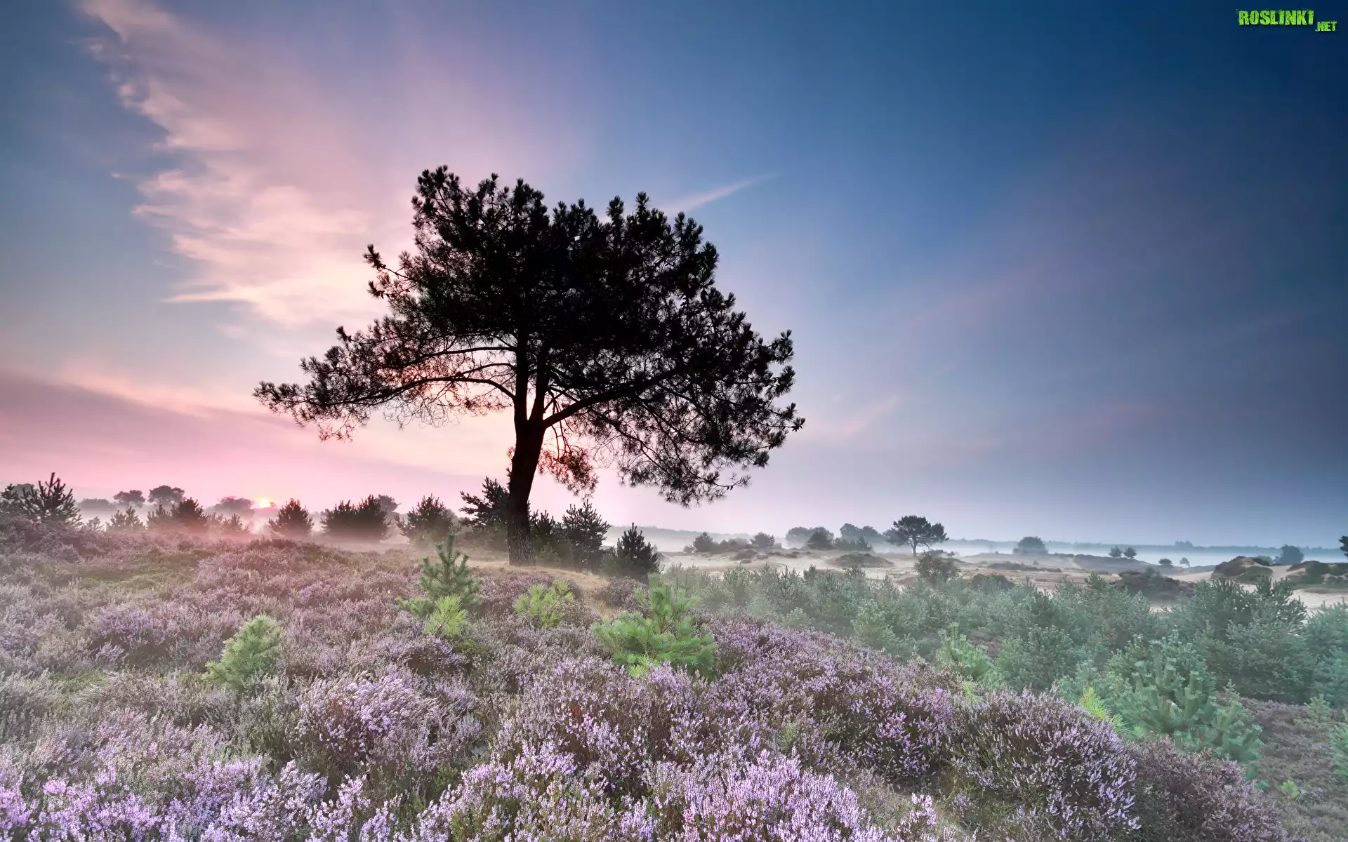 Rośliny: Holandia, Park Narodowy Drents-Friese Wold, Wrzosowisko, Drzewo, Mgła