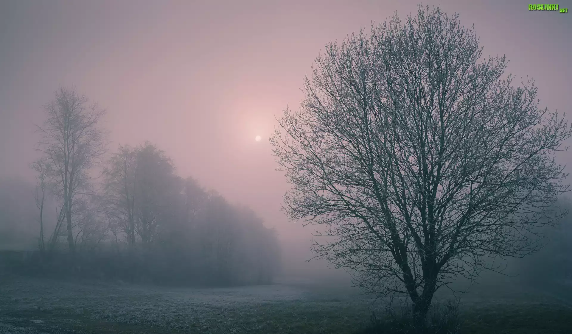 Rośliny: Mgła, Drzewa, Wschód słońca, Oszroniona, Trawa