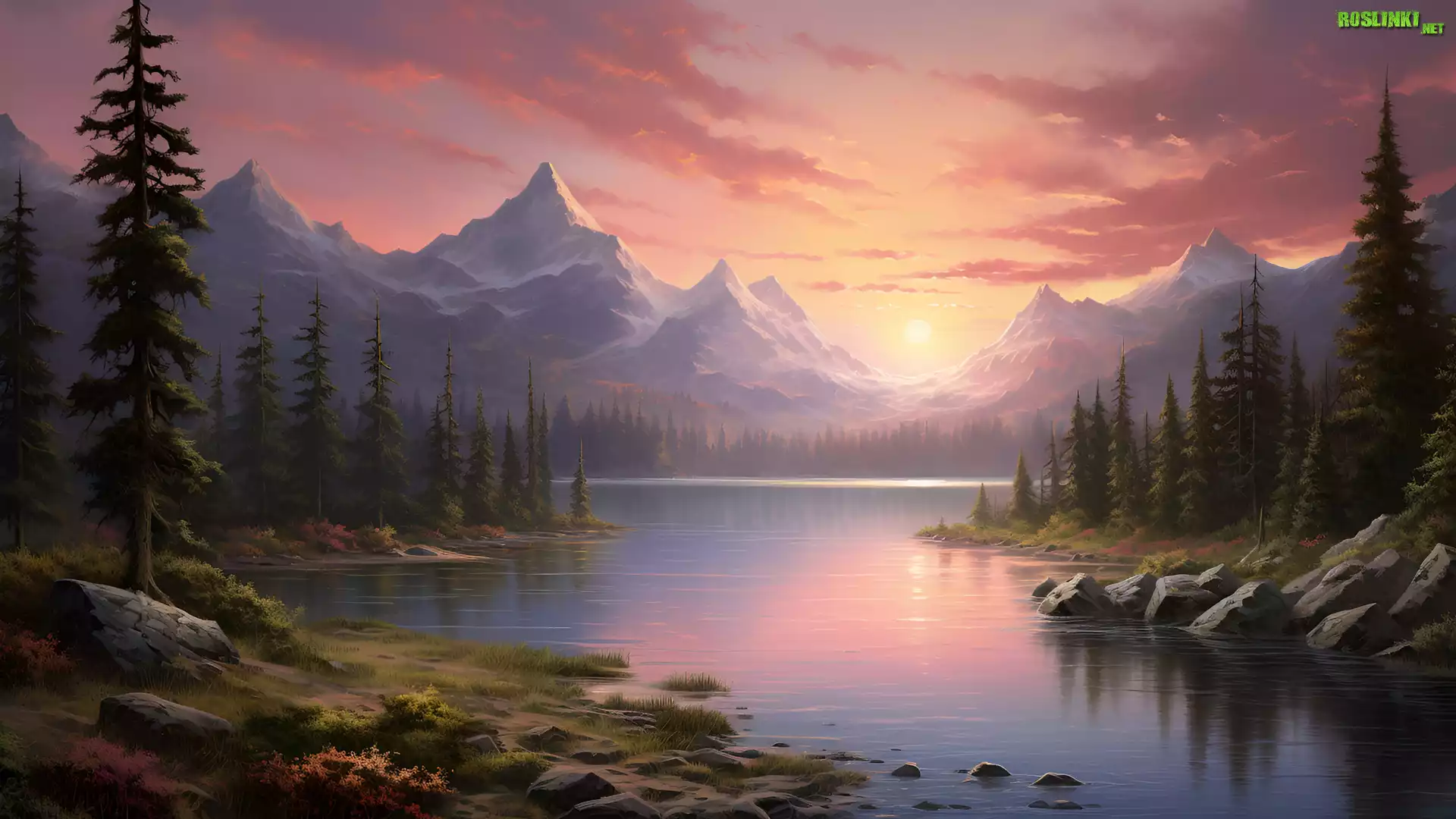 Rośliny: Las, Drzewa, Jezioro, Góry, Kamienie, Brzeg, Mgła, Poranek, Wschód słońca, 2D