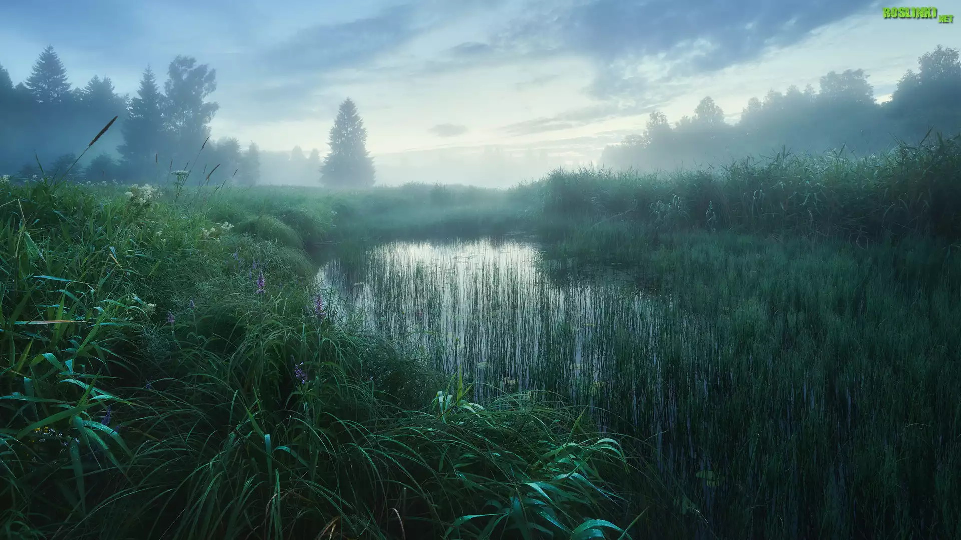 Rośliny: Poranna, Mgła, Staw, Trawy, Las, Niebo, Drzewa