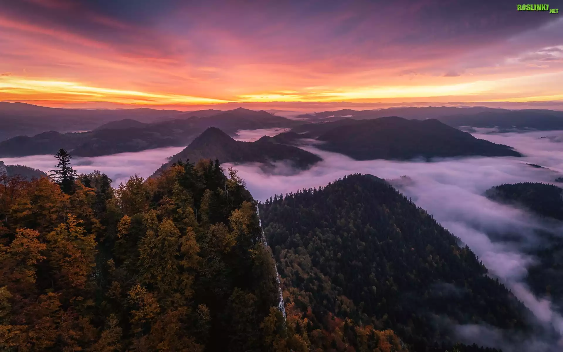 Rośliny: Góry, Las, Drzewa, Mgła, Zachód słońca