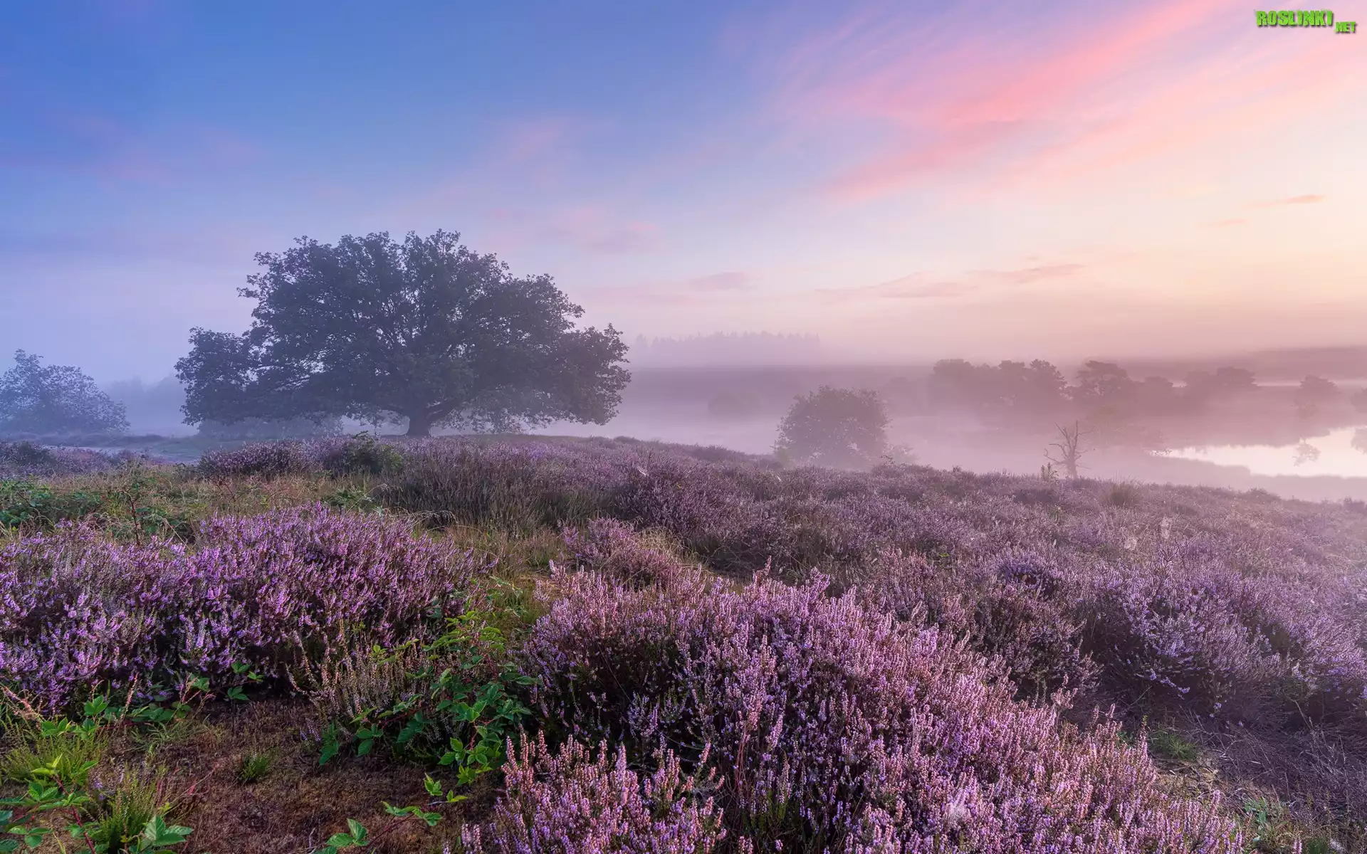 Rośliny: Wrzosy, Wrzosowisko, Drzewa, Mgła, Wschód słońca