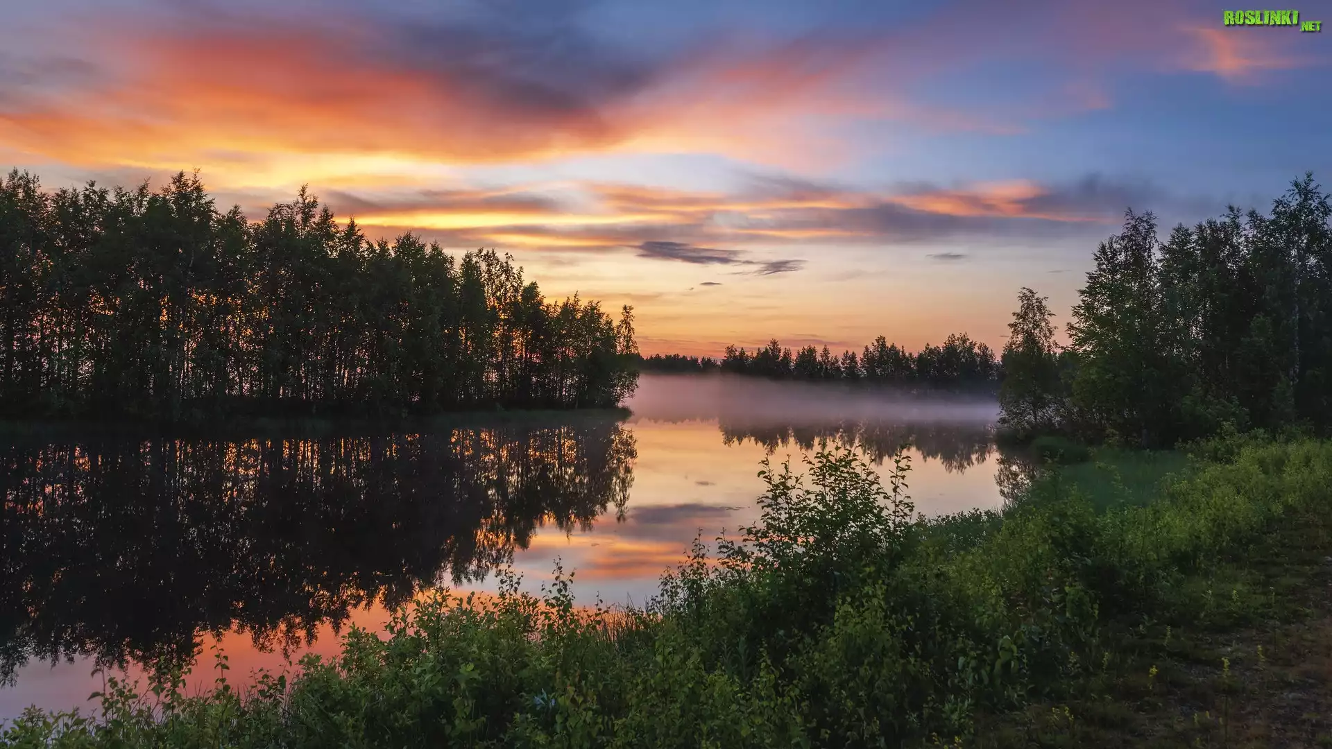 Rośliny: Rzeka, Drzewa, Roślinność, Mgła, Zachód słońca