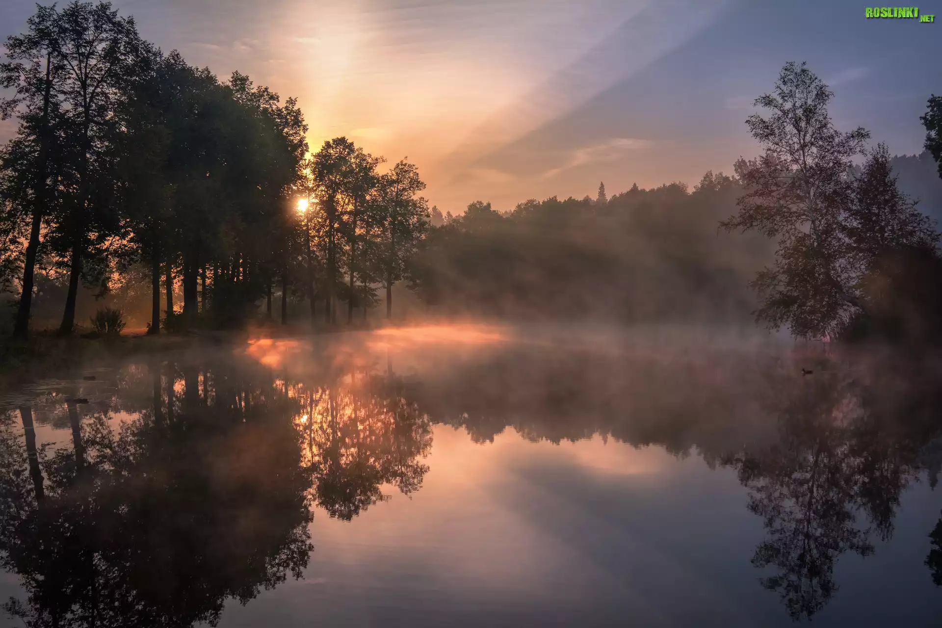 Staw Barski, Poranek, Wschód słońca, Mgła, Drzewa, Odbicie, Serednikowo, Obwód moskiewski, Rosja |