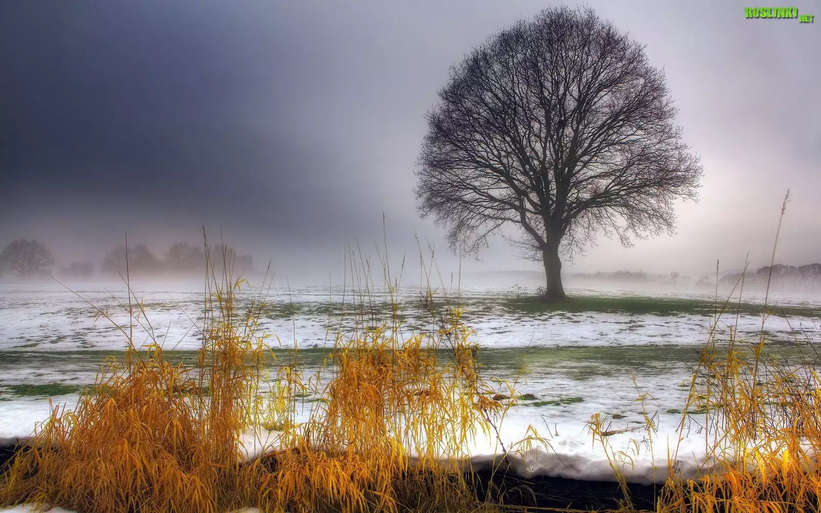 Mgła, Śnieg, Drzewo, Suche, Trawy