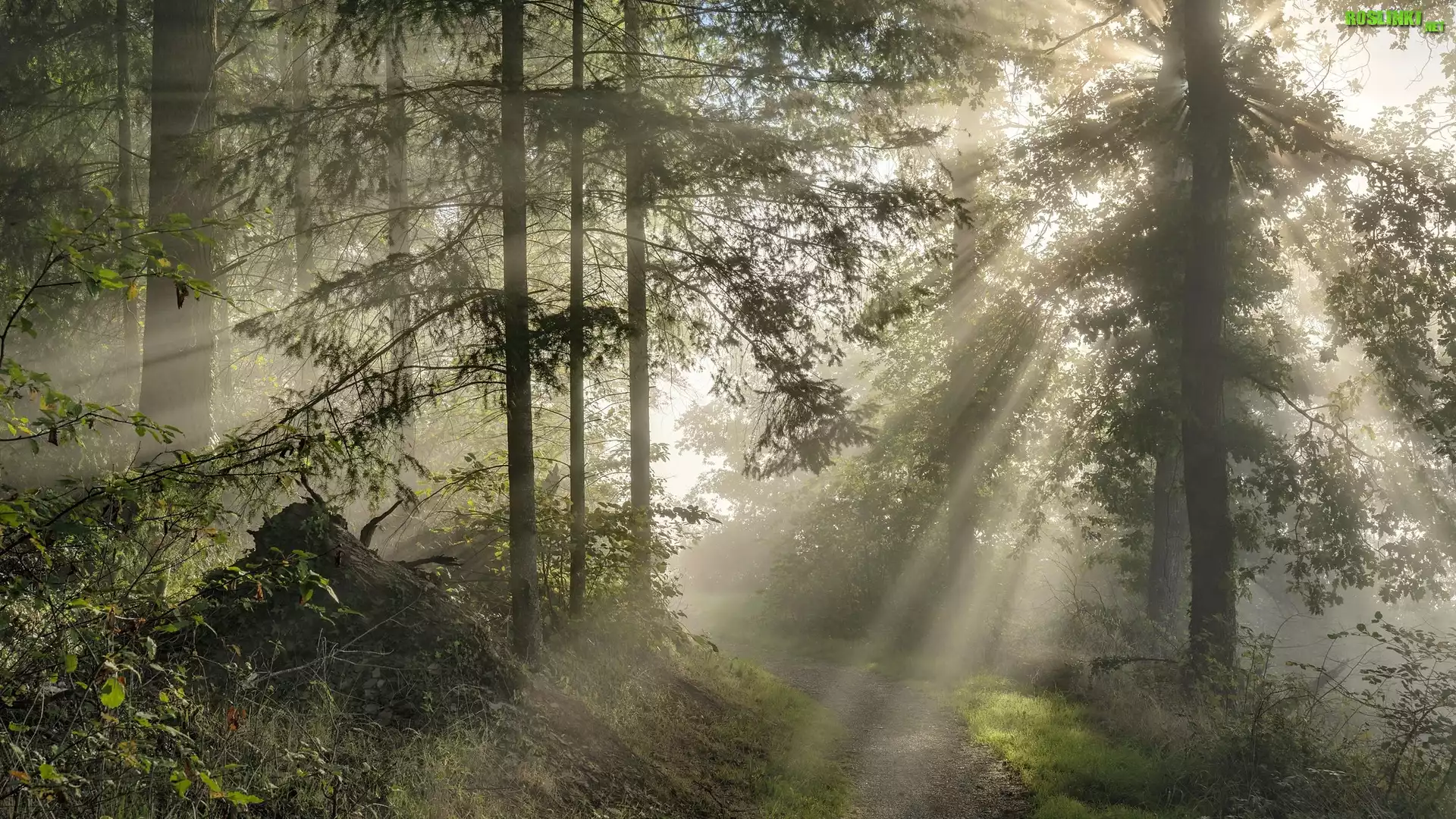 Rośliny: Las, Drzewa, Droga, Mgła, Przebijające światło