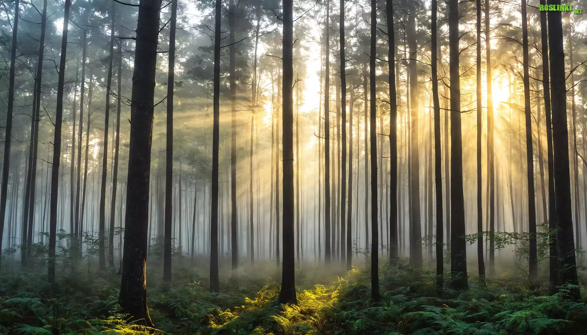 Rośliny: Las, Drzewa, Paprocie, Mgła, Przebijające światło