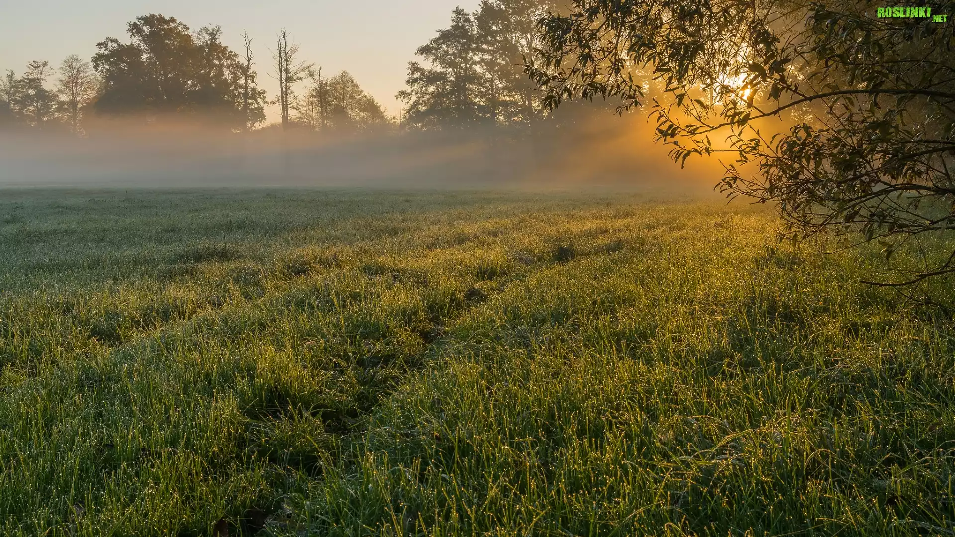 Rośliny: Łąka, Trawa, Drzewa, Mgła, Poranek