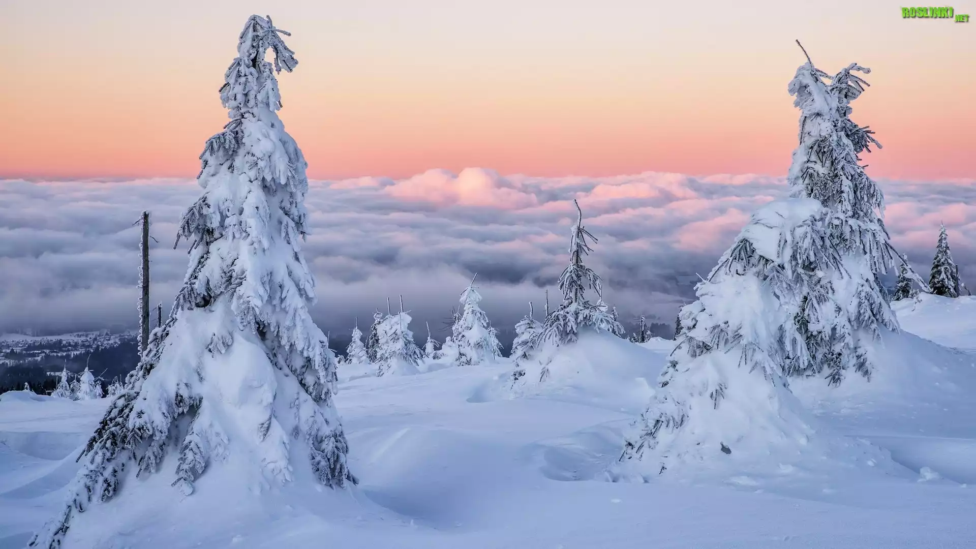 Rośliny: Zima, Poranek, Wschód słońca, Ośnieżone, Drzewa, Opadająca, Mgła