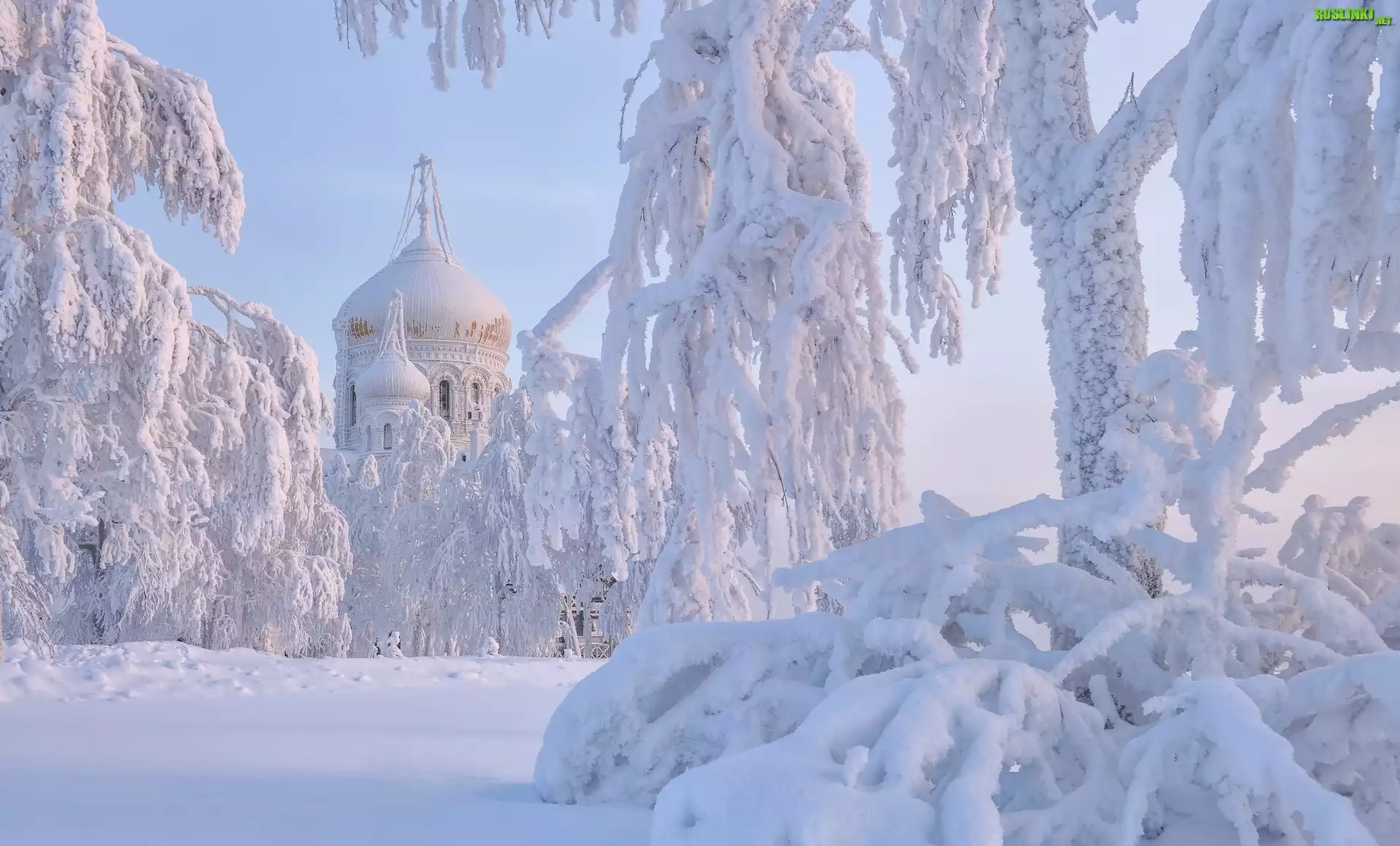 Cerkiew, Białogórski Monaster św Mikołaja, Zima, Śnieg, Ośnieżone, Drzewa, Biała Góra, Obwód permski, Rosja |