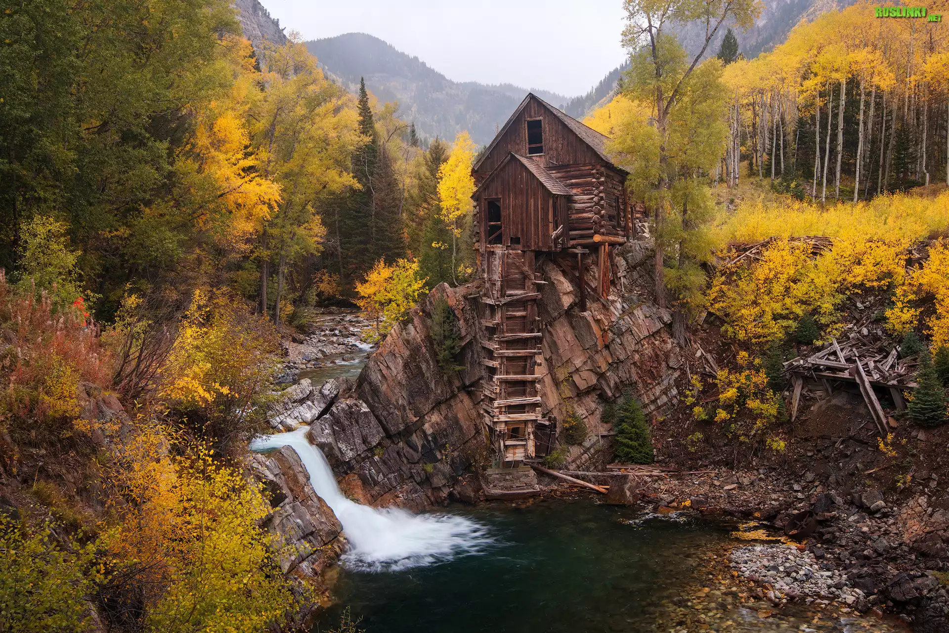 Młyn Crystal Mill, Kryształowy Młyn, Las, Drzewa, Góry, Rzeka Crystal River, Jesień, Stan Kolorado, Stany Zjednoczone |